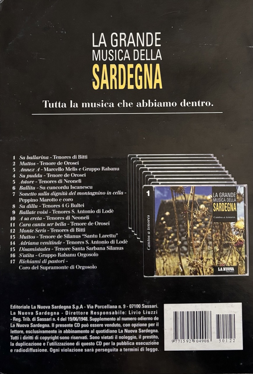 Man mano che passava il tempo, però, ho notato un progressivo ed allarmante impoverimento di questo variegato scenario, soprattutto nelle sue forme più antiche ed originali. La recente scomparsa di alcuni dei capostipiti di queste tradizioni e la pubblicazione di lavori musicali sempre più “contaminati” nel genere e nelle tecniche di registrazione (personalmente mi ribello all’idea di aggiungere a questi “documenti sonori” riverberi digitali o altri effetti elettronici) mi ha spinto verso l’idea di creare una collana di canti a chitarra. Un lavoro di ricerca sul campo,dunque, per lo più registrato negli stessi luoghi e situazioni in cui le varie forme musicali sono nate e si sono consolidate nell’animo musicale del popolo sardo…” (Andrea Parodi).